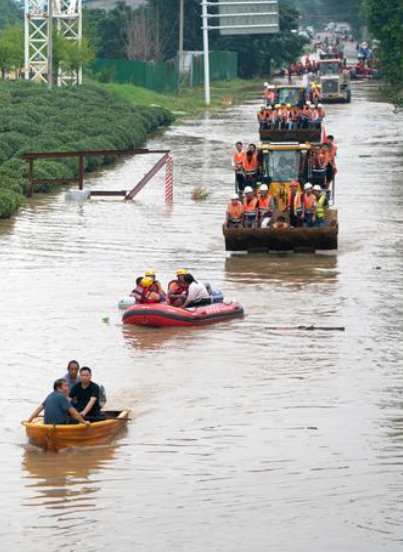 7月22日,京港澳高速惠民三路交叉口附近,救生艇、铲车等齐上阵,转移附近被困群众。记者 马健 摄