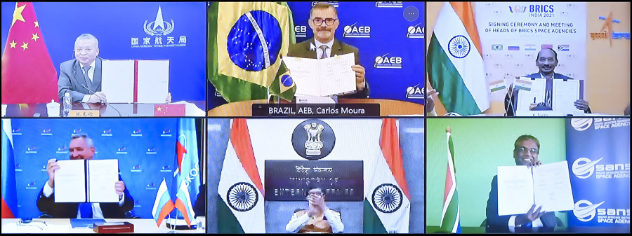 澎湃新闻记者从国家航天局获悉,2021年8月18日,国家航天局局长张克俭与巴西航天局局长卡洛斯·莫拉、俄罗斯国家航天集团总经理罗戈津、印度空间研究组织主席西万和南非国家航天局局长穆萨米等金砖国家航天机构负责人进行了视频会议,并签署了《关于金砖国家遥感卫星星座合作的协定》。