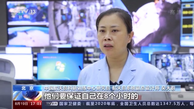 中国航天员科研训练中心研究员 航天员系统副总设计师 吴大蔚:他们要保证自己在8个小时的出舱活动当中,完好的这种体能状态,出舱之前身体也是健康的,所以呢他们会在出舱前相应的,除了锻炼以外的运动肺功能的检查,一系列的这个尿常规的测试等等这些工作也要按计划开展,确保他在出舱前,是一个整装待发的,人是一个很好的一个状态。