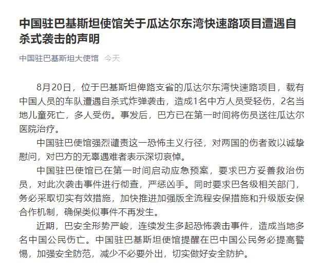 载中国人车辆在巴基斯坦遭炸弹袭击,1名中方人员受伤