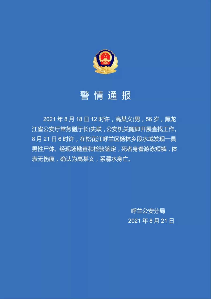 黑龙江省哈尔滨市呼兰区分局8月21日发布警情通报:8月18日12时许,高某义(男,56岁,黑龙江省公安厅常务副厅长)失联,公安机关随即开展查找工作。
