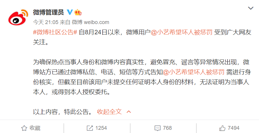 为确保热点当事人身份和微博内容真实性,避免冒充、谣言等异常情况出现,微博站方已通过微博私信、电话、短信等方式告知@小艺希望坏人被惩罚需进行身份核实,但截至目前该用户未提交任何证明本人身份的材料,无法证明为当事人本人,或得到本人授权委托。