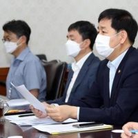 8月25日,在中央政府首尔办公大楼,韩国国务调整室室长具润哲(右二)主持召开关于应对日本福岛核废水的有关部门次官(副部长)会议