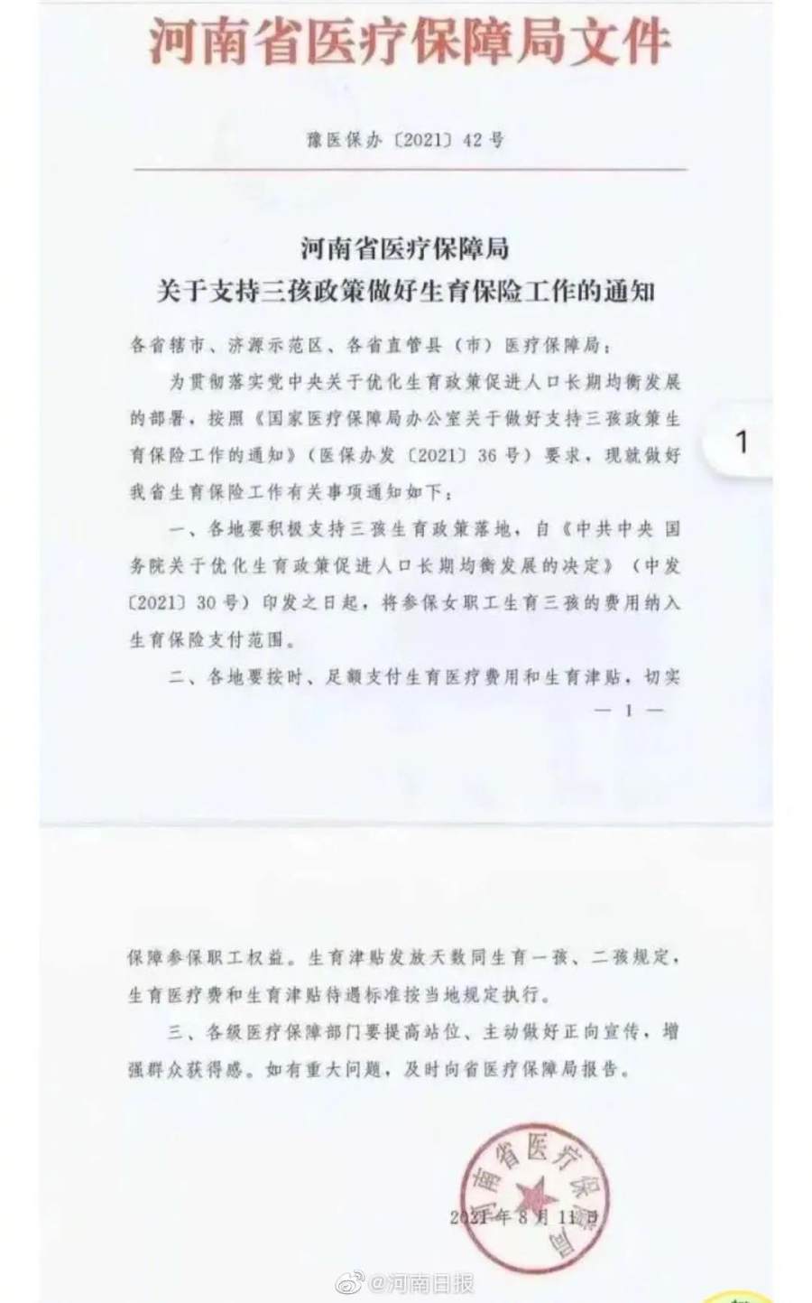 8月25日,记者从省医保局获悉,为支持三孩政策在河南落地实施,日前该局出台文件明确,自6月26日国家出台《关于优化生育政策促进人口长期均衡发展的决定》起,将参保女职工生育三孩的费用纳入生育保险支付范围,各地要按时、足额支付生育医疗费用和生育津贴,生育津贴发放天数同生育一孩、二孩规定,生育医疗费和生育津贴待遇标准按当地规定执行。
