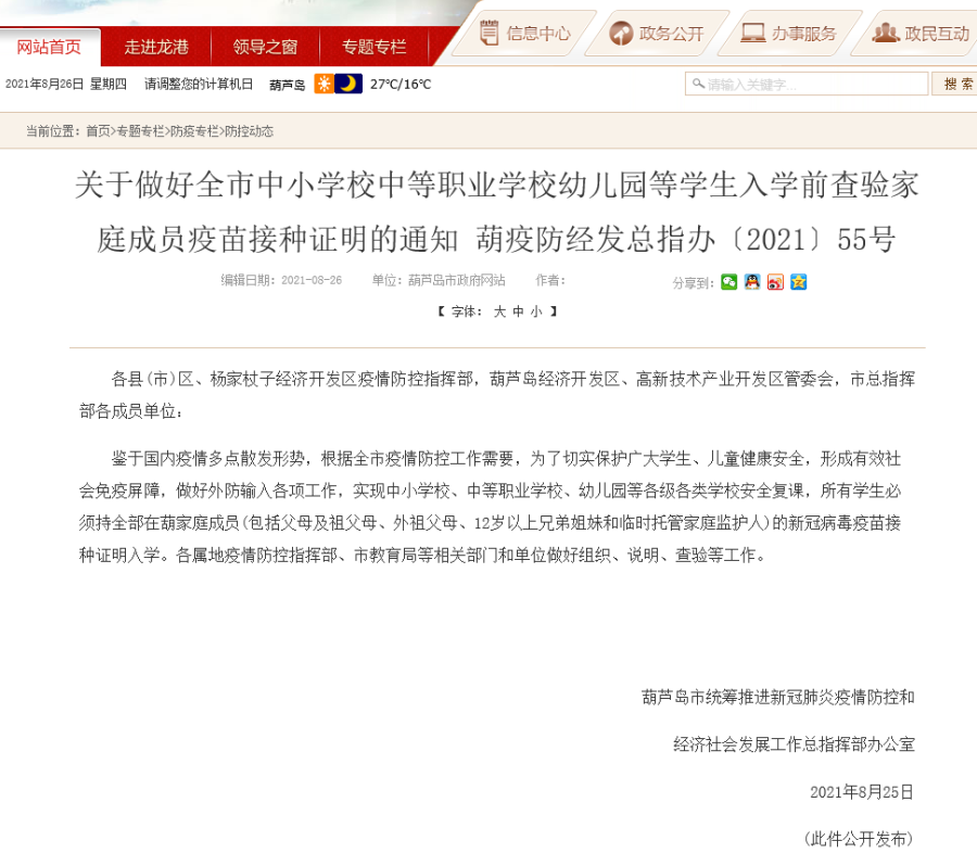 据辽宁省葫芦岛市人民政府网站26日消息,葫芦岛市统筹推进新冠肺炎疫情防控和经济社会发展工作总指挥部办公室发布《关于做好全市中小学校中等职业学校幼儿园等学生入学前查验家庭成员疫苗接种证明的通知》。