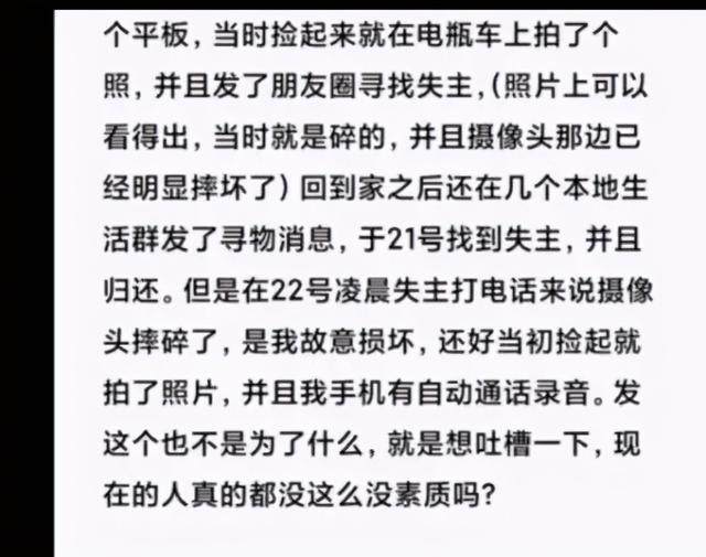 浙江省湖州市的陆先生,在8月20日晚捡到一个iPad,连夜在多个本地生活群中发消息寻找失主。第二天归还后,却接到失主姜女士的电话,称怀疑他故意砸坏了平板的摄像头,并质问平板的电容笔为何不见了,这让陆先生颇为糟心。
