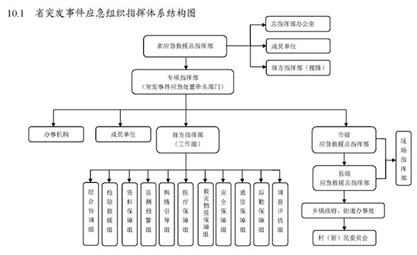 省级应急救援指挥体系由省政府应急救援总指挥部(以下简称总指挥部)、省政府专项应急指挥部(以下简称专项指挥部)、前方指挥部组成。总指挥部、专项指挥部是省级应对突发事件的指挥协调机构;前方指挥部是省级应对突发事件的现场组织指挥机构,指导市、县级现场指挥部开展突发事件应急处置工作。