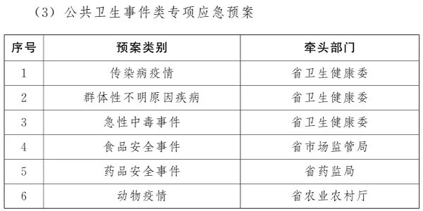 (3)公共卫生事件。主要包括传染病疫情、群体性不明原因疾病、职业中毒事件、食品和药品安全事件、动物疫情以及其他严重影响公众健康和生命安全的事件。