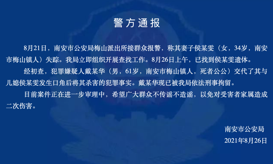 经初查,犯罪嫌疑人戴某华(男,61岁,南安市梅山镇人,死者公公)交代了其与儿媳侯某雯发生口角后将其杀害的犯罪事实。戴某华现已被依法刑事拘留。目前案件正在进一步审理中。