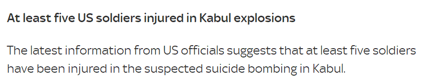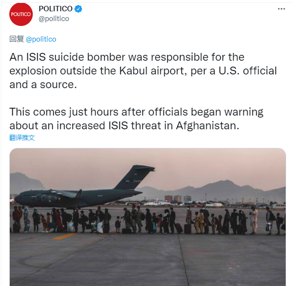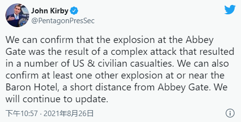 此外,据中央广播电视总台驻喀布尔记者站报道员消息,喀布尔机场附近的两次爆炸后,喀布尔城内陆续传来数次爆炸声,阿富汗塔利班发言人扎比乌拉·穆贾希德在社交媒体上表示,城内的爆炸声是美军销毁其装备引起的,请市民不必担心。