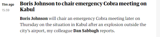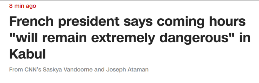 英国《卫报》26日早些时候消息称,英国武装部队国务大臣詹姆斯•希佩表示,有“非常可靠的报告”说,阿富汗喀布尔机场即将受到“严重”袭击,并且可能在“数小时内”发生。“现在有一个非常非常可靠的关于(喀布尔机场)即将受到袭击的报告。”希佩在英国广播公司(BBC)一档电台节目上说,“关于该威胁的报告非常可靠,并且迫在眉睫。我只能说该威胁很严重。”