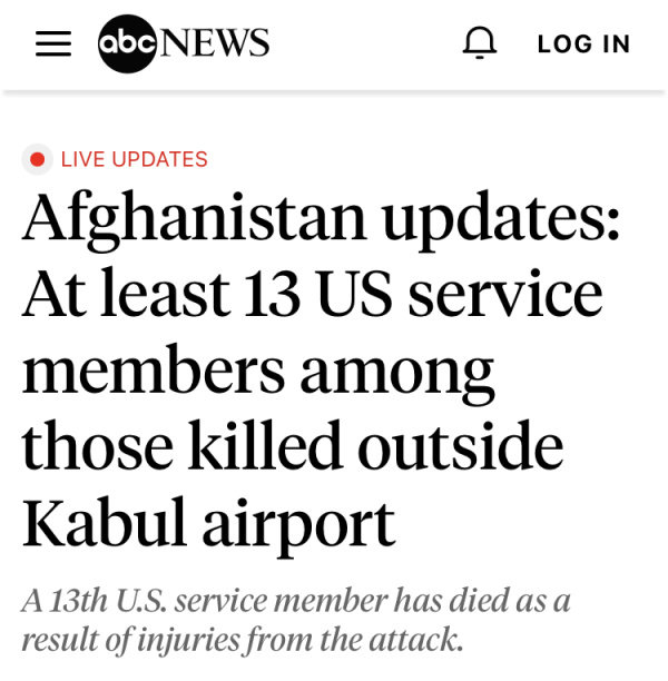 据美国ABC刚刚消息,美官员称第13名美军人员在喀布尔机场附近爆炸事件中死亡。