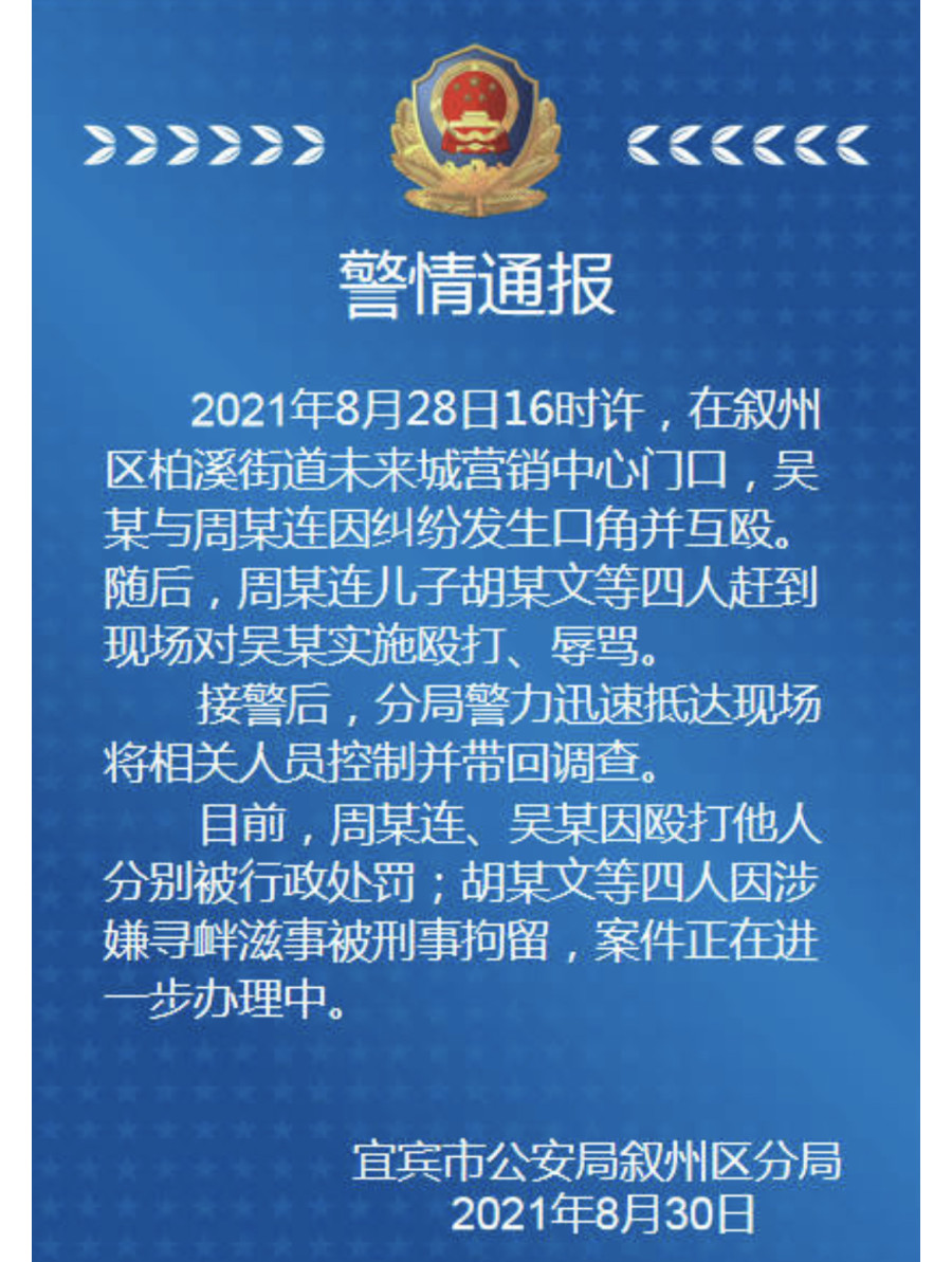 警方通报称:2021年8月28日16时许,在叙州区柏溪街道未来城营销中心门口,吴某与周某连因纠纷发生口角并互殴。随后,周某连儿子胡某文等四人赶到现场对吴某实施殴打、辱骂。