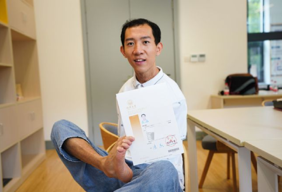 四川男孩彭超,6岁时因触电失去双臂,学着以脚代手学习、生活。2019年从四川大学法学院毕业后,彭超又通过考研复试,成为同济大学的研究生。为方便其学习生活,同济大学专门把彭超的宿舍安排在一楼,对大门、电灯、卫生间等设施进行了改造,浴室的开关用脚就可以打开,淋浴头也根据他的身高作了调整。