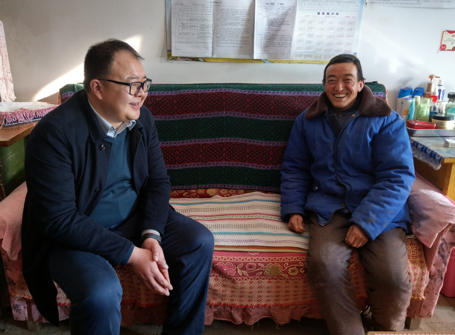 邱军(左)在乔川乡村民家中宣讲扶贫政策(2019年1月25日摄)。