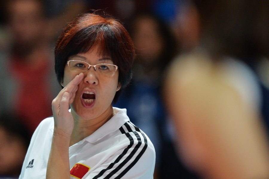 2015年5月27日,天津,2015女排亚锦赛半决赛中国Vs泰国的比赛中,郎平给队员加油打气。