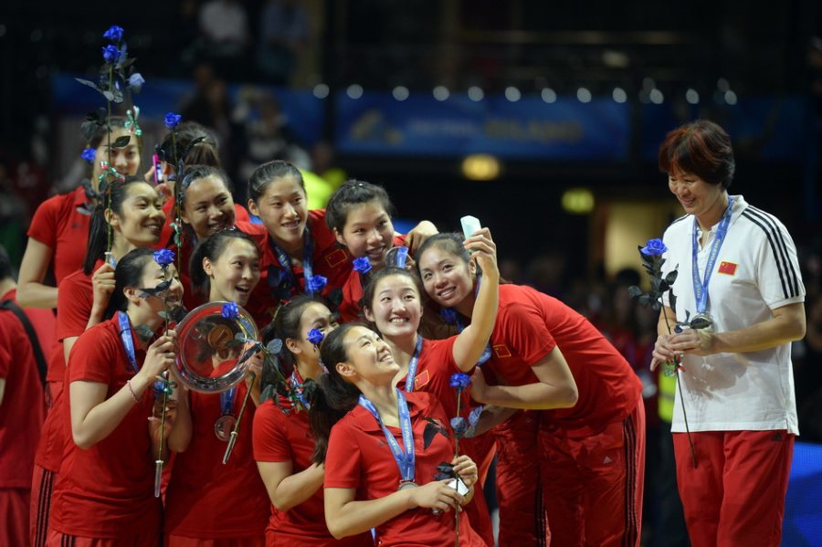 2015年9月6日,日本名古屋,2015女排世界杯第四阶段,中国女排战胜日本队,最终获得冠军。女排队员和教练赛后合影。