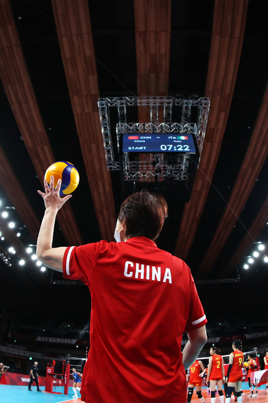 2021年7月31日,中国队主教练郎平在开赛前。当日,在东京奥运会女子排球小组赛中,中国队战胜意大利队。