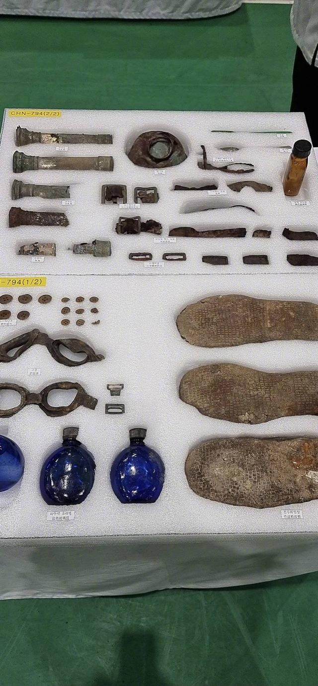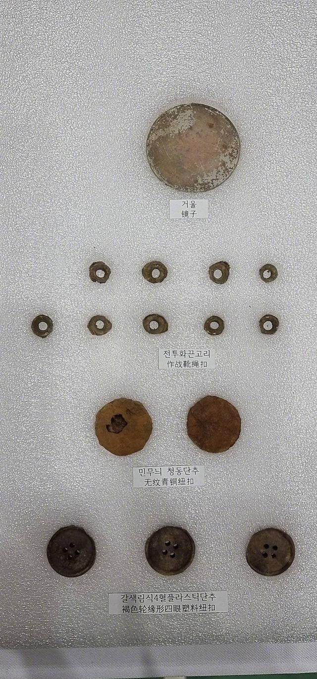 本次交接现场除遗骸外,摆有钢笔、战靴靴底板、毛主席徽章、抗美援朝纪念勋章等遗物。