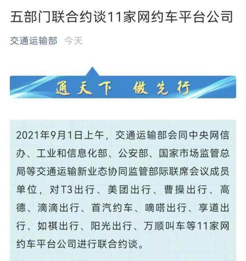 9月1日上午,交通运输部会同中央网信办、工业和信息化部、公安部、国家市场监管总局等交通运输新业态协同监管部际联席会议成员单位,对T3出行、美团出行、曹操出行、高德、滴滴出行、首汽约车、嘀嗒出行、享道出行、如祺出行、阳光出行、万顺叫车等11家网约车平台公司进行联合约谈。