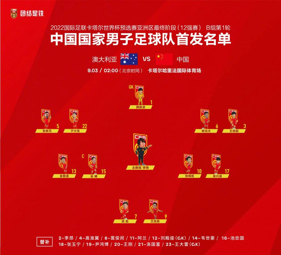 对阵澳大利亚队,中国男足的首发名单。