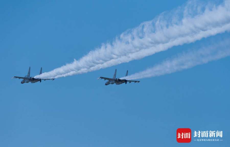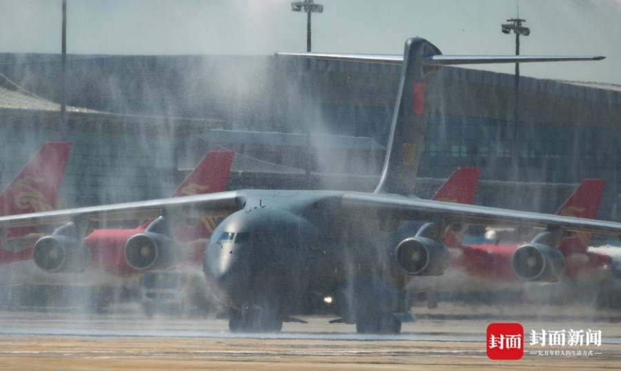 9月2日上午的迎回仪式现场,《思念曲》回荡耳边,当所有人沉浸在一片静默中时,两架战斗机开始在空中盘旋、轰鸣,载有烈士遗骸的“运-20”运输机降落在沈阳桃仙国际机场,然后通过“水门”,进入人群视线。