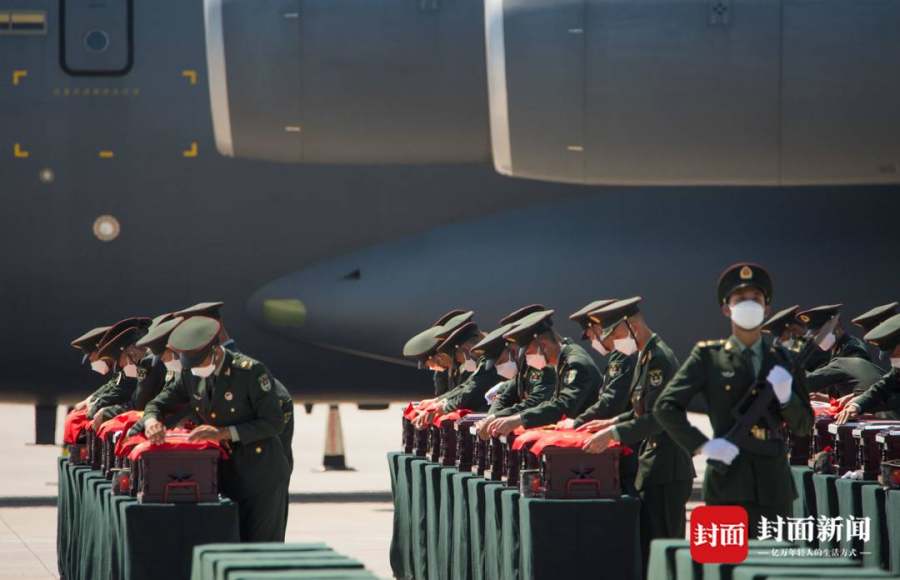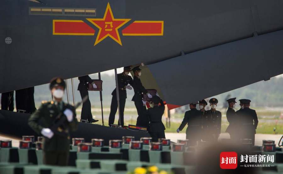 他们被运抵机场,空军专门派出了编号为08的运—20运输机运送,两架战斗机在前方护航,从全国各地闻讯而来的一些老兵和烈士后人,早已在街头注目等候。