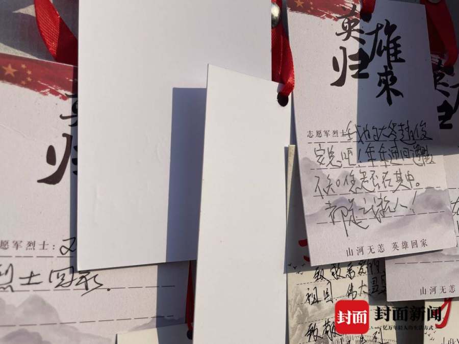 记者注意到,这些便签纸上,有说自己的爷爷曾经是志愿军烈士,虽然可能与第八批在韩志愿军烈士的遗骸关系不大,但同为战友,想来情感是可以共通的,“欢迎你们回家。”