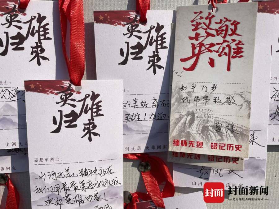 沈阳烈士陵园外,印有“英雄归来”并供市民参观和表达哀思的展板上,便签纸直接粘满了整整一面,人们在那里拍照合影留念。