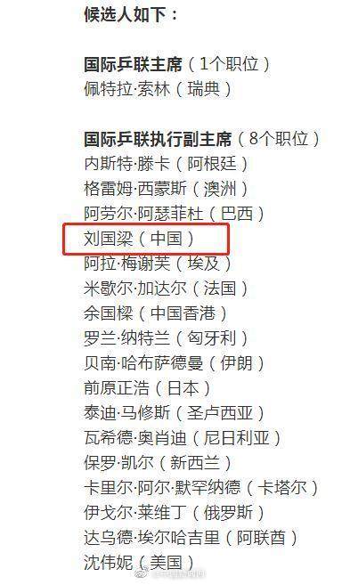 据中国新闻网报道,9月7日,国际乒联提名委员会对国际乒联执行委员会的候选人进行审查,并向成员协会公布候选人名单。中国乒协主席刘国梁被提名国际乒联执行副主席一职。2021年11月24日,国际乒联成员将在美国休斯敦举行的国际乒联年度代表大会上投票,选举9名国际乒联执行委员会成员。这9名当选人的任期为四年。
