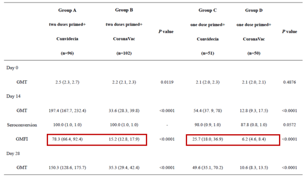 研究人员给志愿者接种两针灭活疫苗后,再接种一针腺病毒载体新冠疫苗作为加强,14天后中和抗体GMTs为197.4 (167.7, 232.4),抗体水平升高约78倍;若第三针用灭活疫苗进行加强,抗体水平为33.6 (28.3, 39.8),升高约15.2倍。该数据表明,序贯加强后产生的中和抗体增长水平显著优于同源加强的效果。