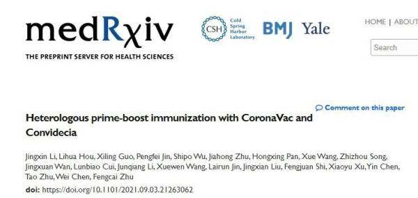 日前,江苏省疾病预防控制中心副主任朱凤才团队与北京生物技术研究所、东南大学等合作单位在医学生物类论文预印本平台medRvix上专门就此发表了题为《Heterologous prime-boost immunization with CoronaVac and Convidecia》的学术论文。