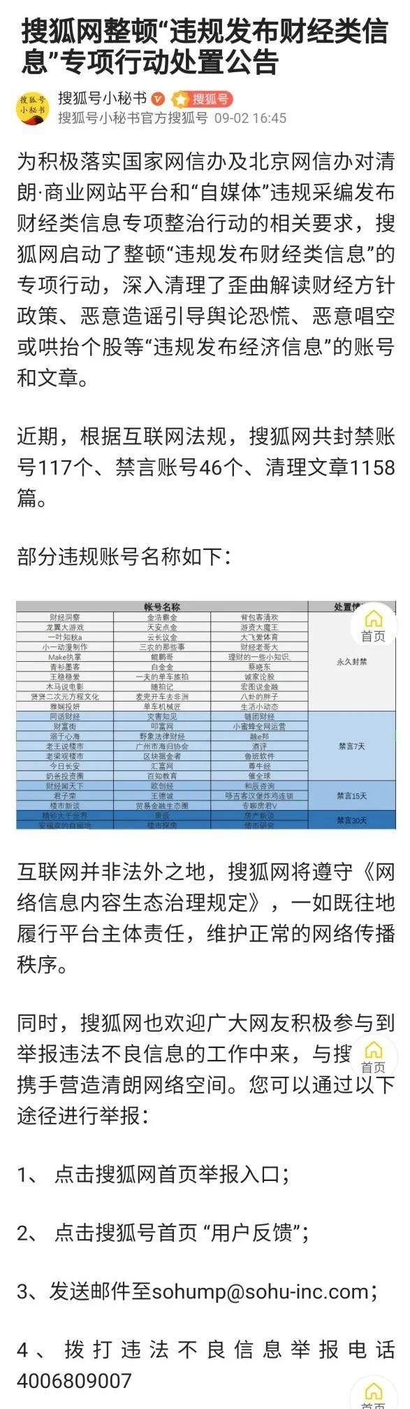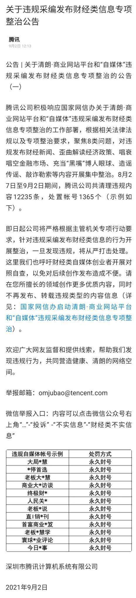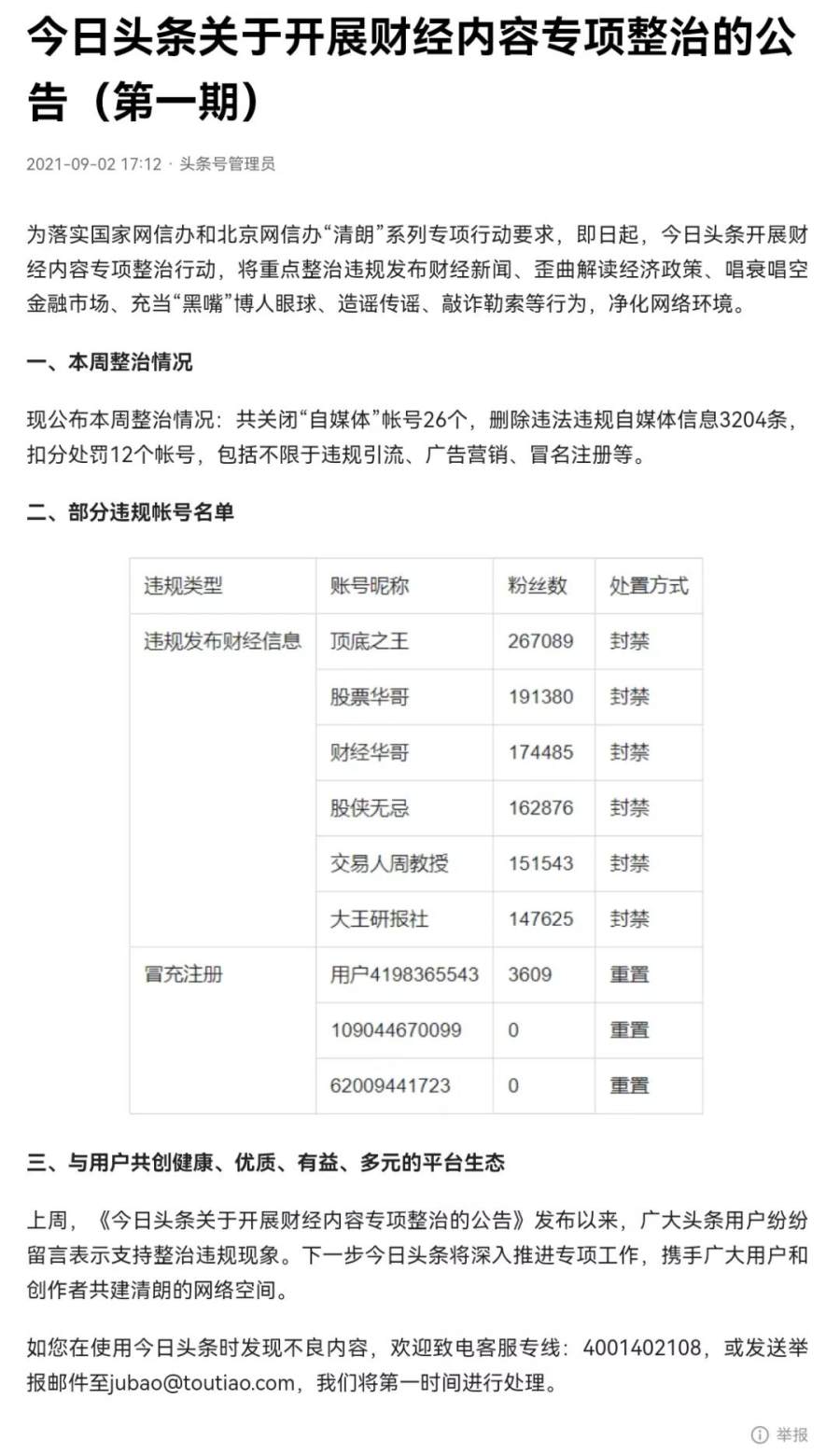8月27日,国家网信办启动清朗·商业网站平台和“自媒体”违规采编发布财经类信息专项整治以来,主要商业网站平台迅速行动,认真开展自查自纠,集中整治扰乱财经领域网络传播秩序8类违规突出问题。目前,已处置违规“自媒体”账号2929个,清理有害信息47153条,其中,关停封禁账号1793个,包括3个100万以上粉丝账号。主要商业网站平台已发布公告,公布整治工作进展,并设置举报入口,欢迎广大网民积极举报,共建清朗网络空间。