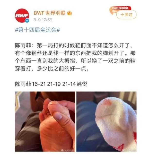 直播视频显示,陈雨菲在第二局时右脚大脚趾被运动鞋划伤,伤口流血。在包扎后,她继续进行比赛,并以2:1的成绩战胜对手。之后,陈雨菲面对镜头表示,“那个鞋不知道怎么回事,它的前面就开了。开了以后它就顶住我的大脚趾,然后皮就开了”。