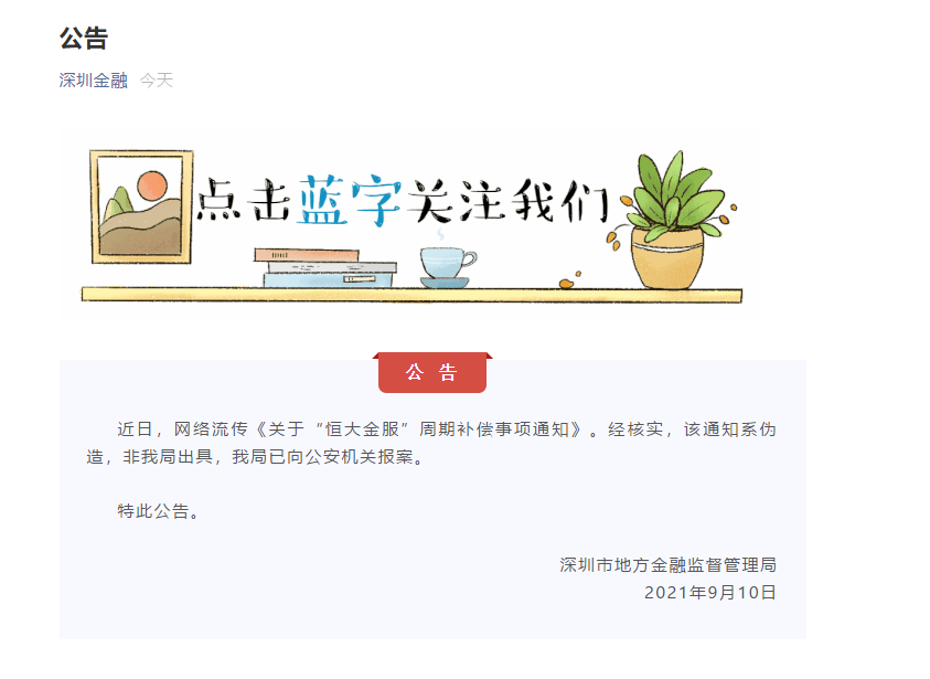深圳市地方金融监督管理局9月10日发布公告,称网络流传《关于“恒大金服”周期补偿事项通知》。经核实,该通知系伪造,非该局出具,已向公安机关报案。