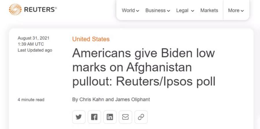 △路透社和益普索民调:美国人在阿富汗撤军上给了拜登低分