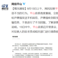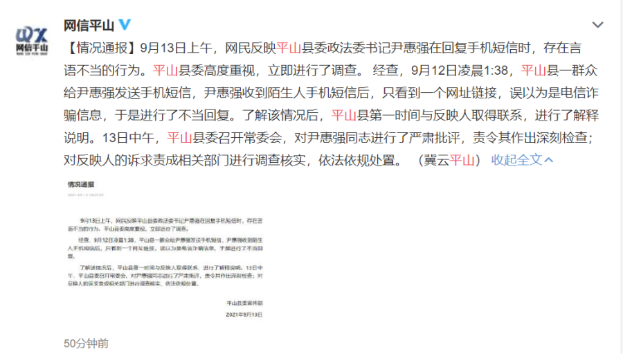 9月13日上午,网民反映平山县委政法委书记尹惠强在回复手机短信时,存在言语不当的行为。平山县委高度重视,立即进行了调查。 经查,9月12日凌晨1:38,平山县一群众给尹惠强发送手机短信,尹惠强收到陌生人手机短信后,只看到一个网址链接,误以为是电信诈骗信息,于是进行了不当回复。了解该情况后,平山县第一时间与反映人取得联系,进行了解释说明。13日中午,平山县委召开常委会,对尹惠强同志进行了严肃批评,责令其作出深刻检查;对反映人的诉求责成相关部门进行调查核实,依法依规处置。