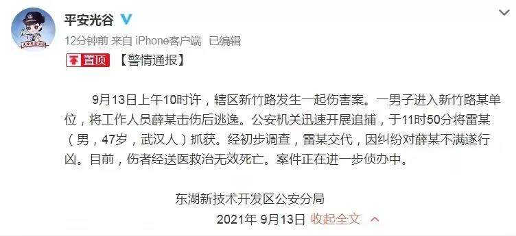 据@平安光谷消息,9月13日上午10时许,武汉辖区新竹路发生一起伤害案。一男子进入新竹路某单位,将工作人员薛某击伤后逃逸。公安机关迅速开展追捕,于11时50分将雷某(男,47岁,武汉人)抓获。经初步调查,雷某交代,因纠纷对薛某不满遂行凶。目前,伤者经送医救治无效死亡。案件正在进一步侦办中。