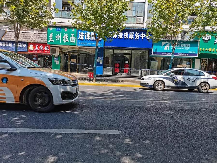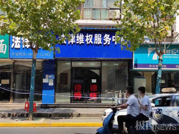 记者在现场看到,事发门店名叫法律维权服务中心,目前门口4个门面全部被围上了蓝色的警戒线,店内有多名警察制服的人正在进行勘察。