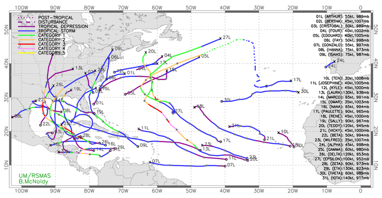 首先,2020年赤道附近的太平洋形成了比预期更强烈的“拉尼娜现象”(又称反圣婴现象,是一种和厄尔尼诺现象相反的现象,即“东太平洋降温阶段”)使得热带大西洋变得更加适宜风暴的形成和加强。