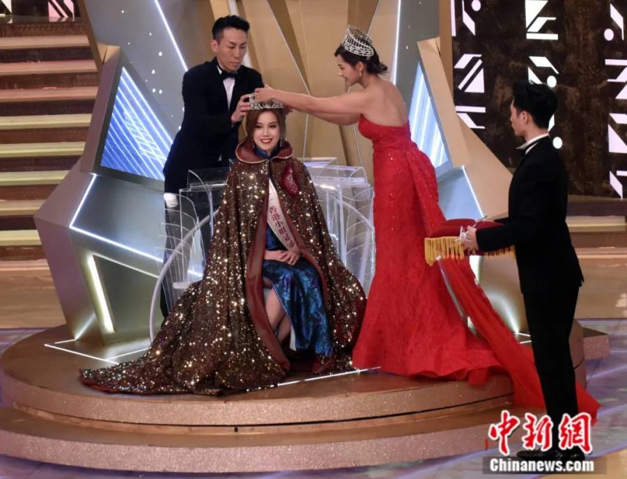 9月12日,2021年香港小姐前三甲诞生。宋宛颖身披闪闪金光的暗红长袍,头顶后冠,从上届冠军谢嘉怡手中接过权杖。