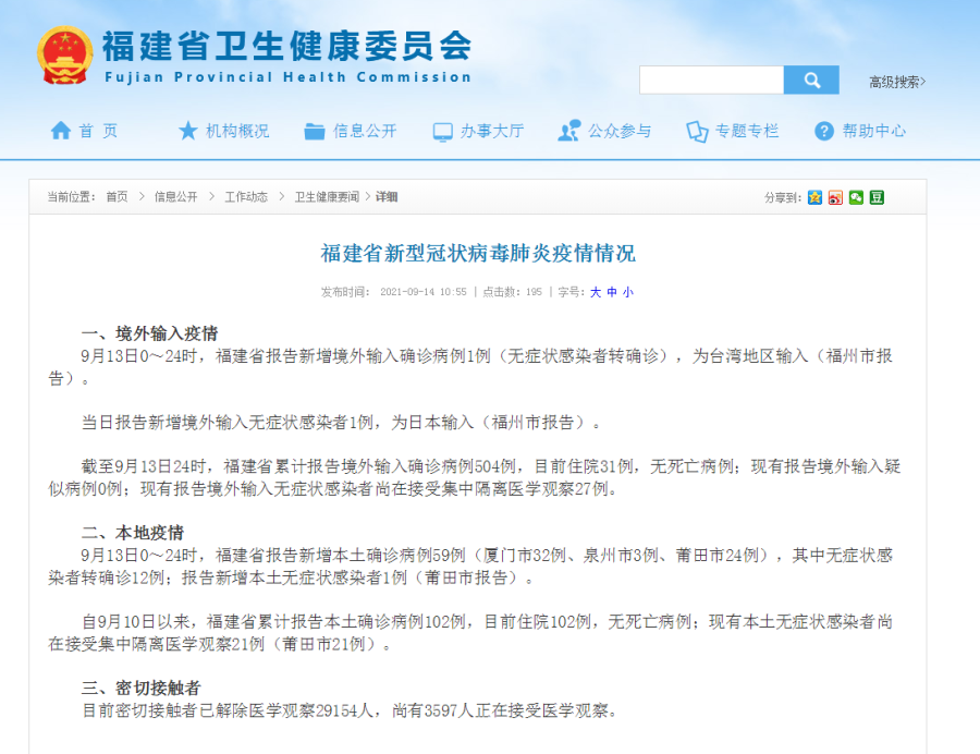 9月13日0~24时,福建省报告新增本土确诊病例59例(厦门市32例、泉州市3例、莆田市24例),其中无症状感染者转确诊12例;报告新增本土无症状感染者1例(莆田市报告)。