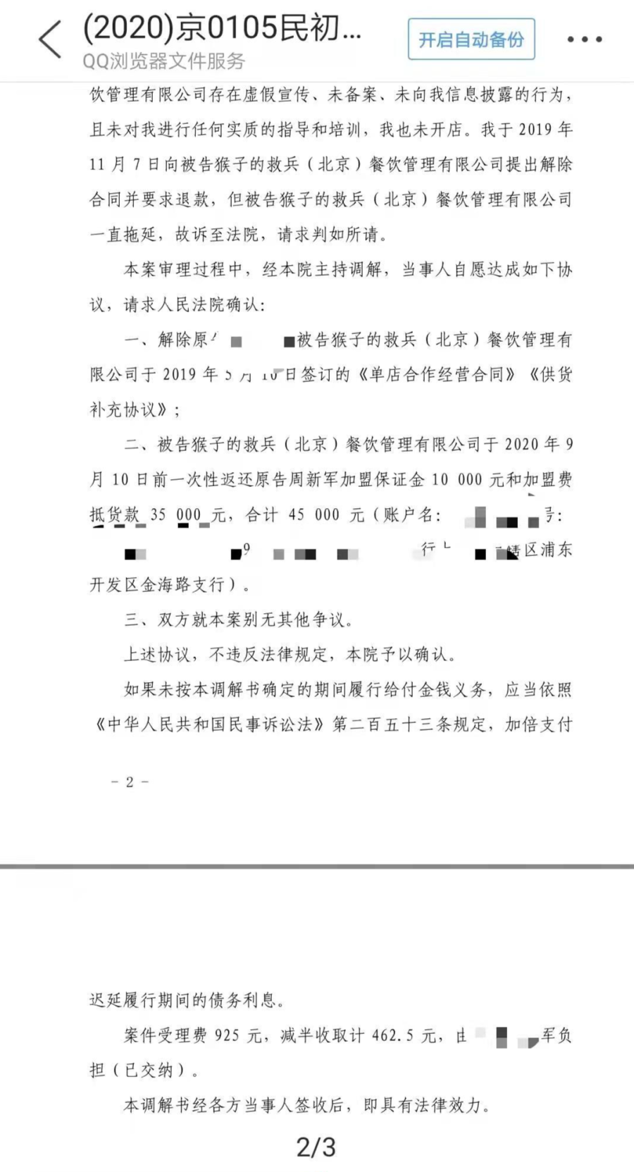 2020年年中,郑先生以“猴子的救兵”公司虚假宣传、未进行特许经营备案等理由,向北京市朝阳区人民法院申请解除合同,要求其返还保证金和加盟费抵货款共45000元。后经法院调解,双方达成了和解协议,“猴子的救兵”公司需要在2020年9月10日前退款,但直到现在,郑先生还有一半的退款迟迟未收到。