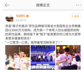 今年6月8日,张继科在本人的微博中提到了“猴子的救兵”,称其“成为第一个体育人创业被国资收购的茶饮品牌”。值得注意的是,这也是唯一一次张继科在其微博提及该品牌。