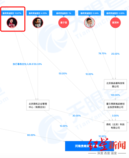 有意思的是,天眼查APP显示,收购“猴子的救兵”的河南贵粮品牌管理集团名下有一家贵粮实业有限公司,后者有两个熟悉的股东,一个是商机科技,另一个是北京商机企业管理中心,与赵子昆关系紧密。
