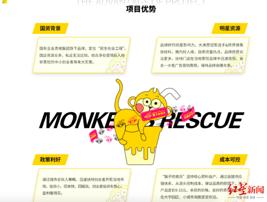 这些也出现在了“猴子的救兵”奶茶店招商宣传中,王先生告诉记者,除了张继科,招商人员还提到真格基金的徐小平、王思聪都有投资。