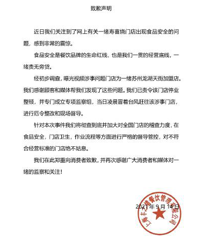 近日,某视频博主暗访一绪寿喜烧某加盟店时,发现店铺存在比目鱼充当鳕鱼、廉价牛肉冒充澳洲和牛、把客人吃剩的刺身回收后继续使用、抹茶粉过期、餐具基本不洗等种种问题。9 月 14 日,一绪寿喜烧发布道歉声明,称已责令该门店停业整顿,并将加大对全国门店的稽查力度。