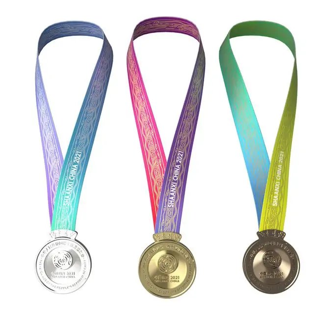 十四运会奖牌设计正面用会徽作为主元素,周围环绕第十四届全国运动会中英文标准字。奖牌背面运用浮雕工艺将秦岭四宝吉祥物形象与秦岭山脉结合,背面最上方环绕了主题口号“全民全运 同心同行”字样。连接奖牌与绶带的卡扣设计提取了国宝文物“何尊”上的“中国”纹样。整体设计简约、大气、庄重,体现出全运会办赛理念和陕西深厚的文化历史底蕴。