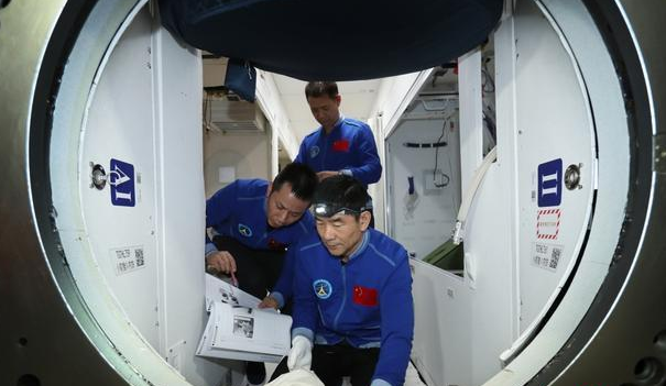 ▲航天员聂海胜、刘伯明和汤洪波在核心舱模拟器内训练。图据央视新闻