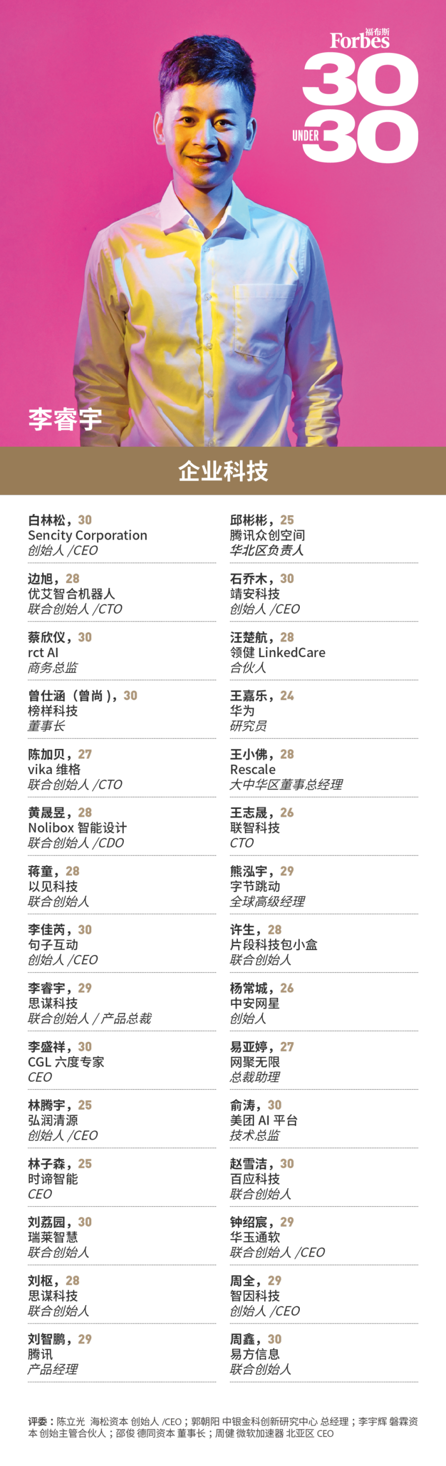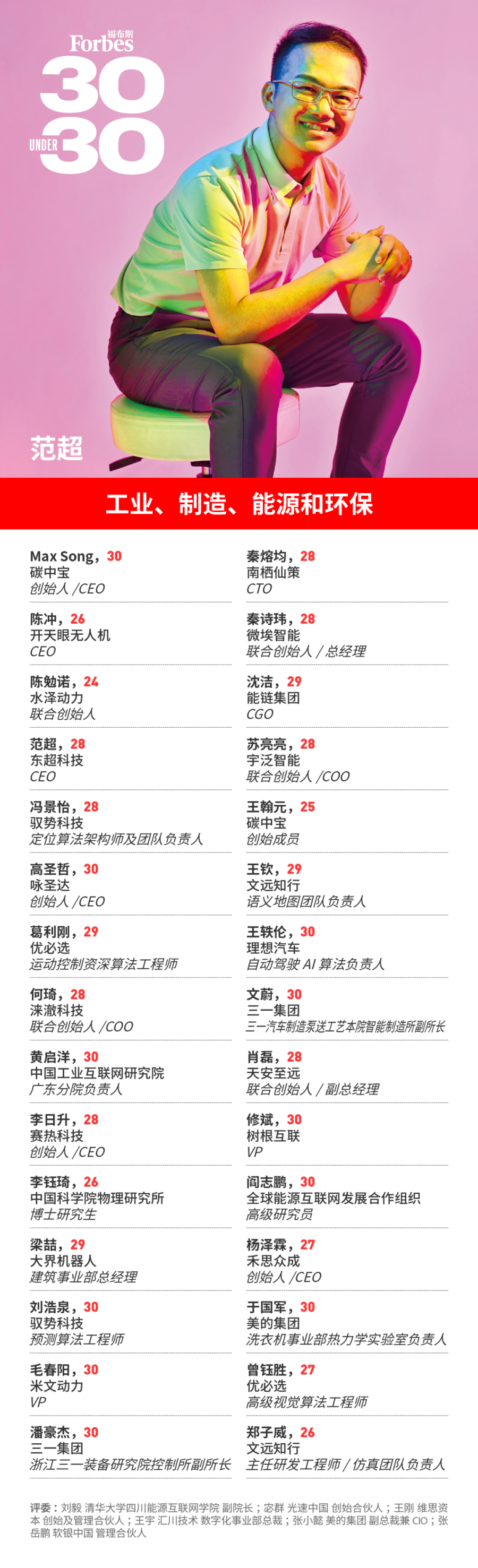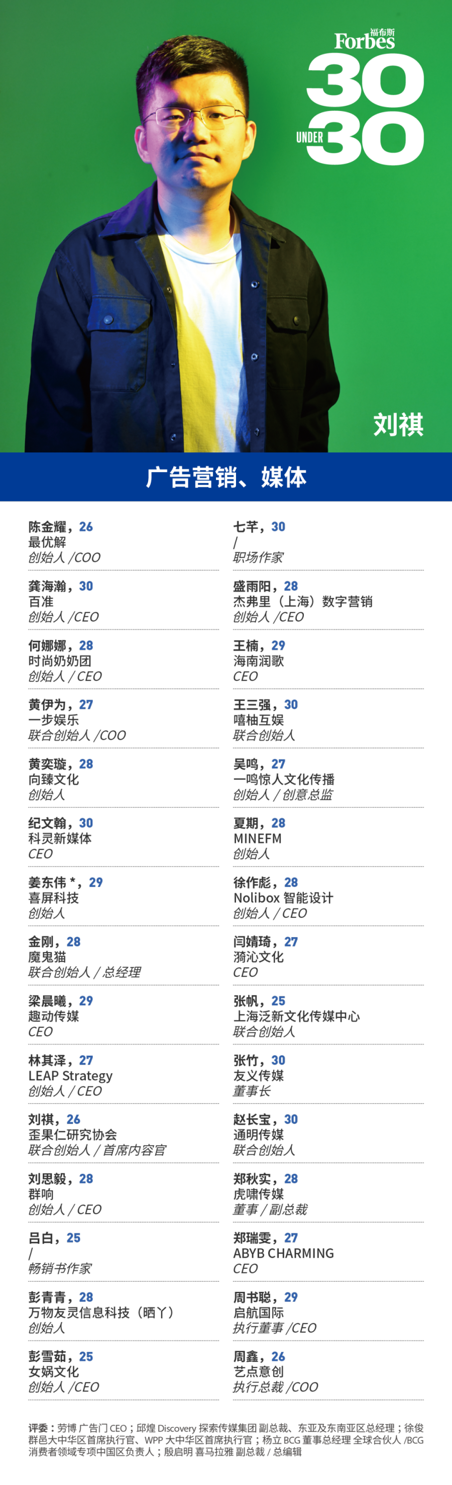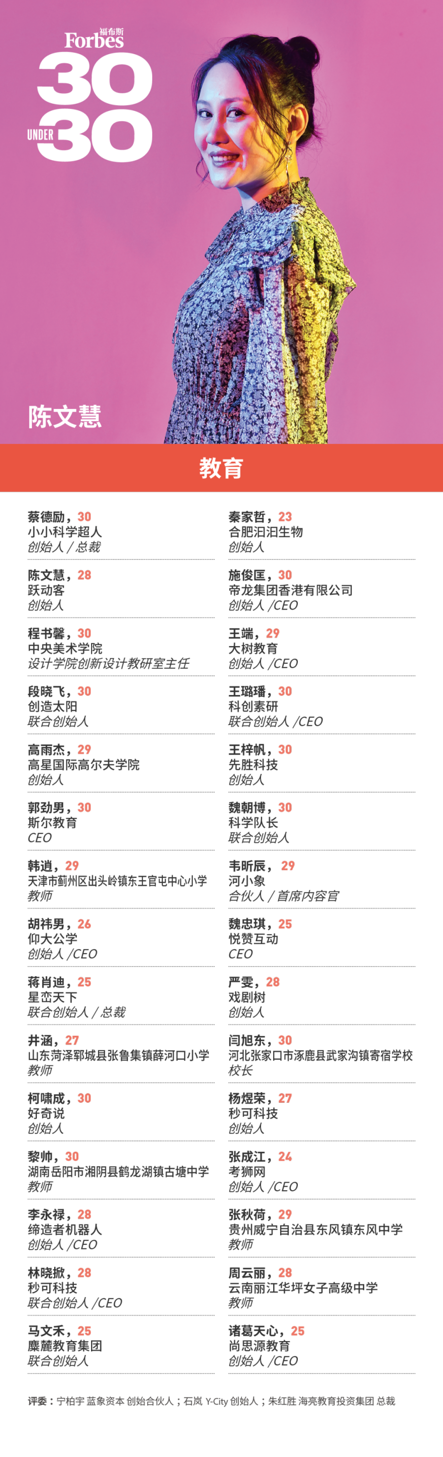 福布斯寻找那些年龄在30岁以下,在业内崭露头角,或者展现出成为未来行业及社会翘楚的潜在力量。他们砥砺前行,不负韶华,在平凡中铸就伟大!这项评选被称为30 Under 30。